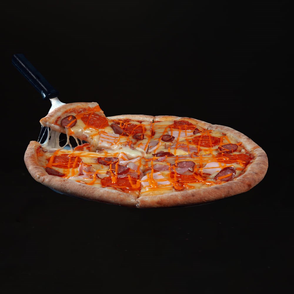 Состав: тесто для пиццы, соус красный, соус 1000 островов, бекон, пепперони, ветчина, колбаски охотничьи, сыр моцарелла