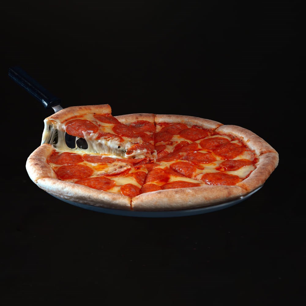 Состав: тесто для пиццы, соус красный, колбаски пепперони, сыр моцарелла