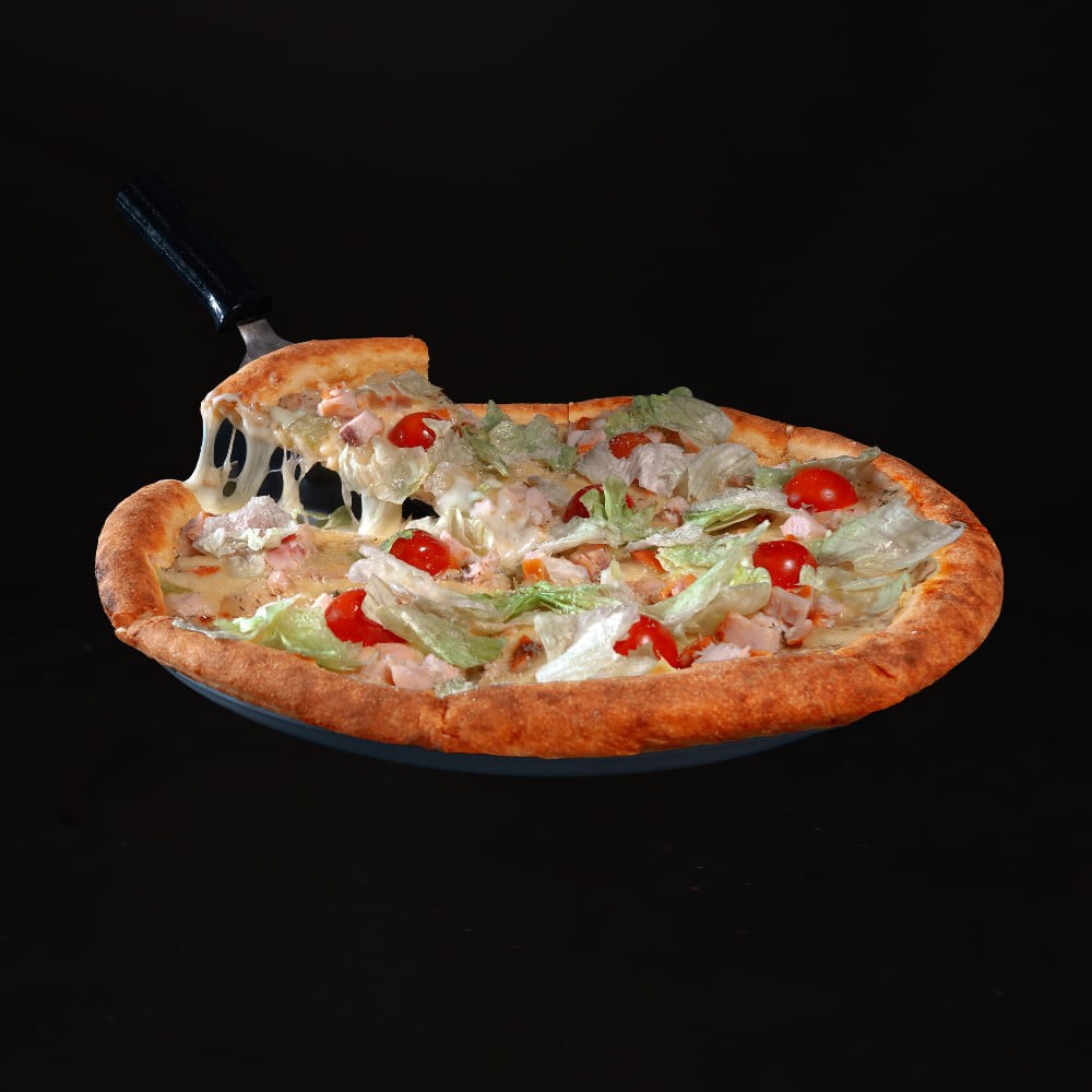 Состав: тесто для пиццы, сыр моцарелла, белый соус, сыр пармезан, помидоры черри, салат айсберг, соус цезарь, курица копченая