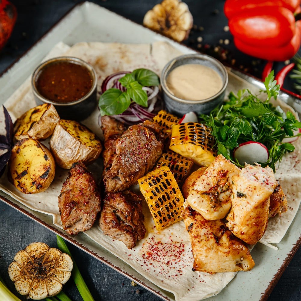 Состав: шашлык из куриной грудки, шашлык из свиной шейки, кукуруза гриль, картофель печеный, два соуса, лаваш, маринованный лук, микс зелени