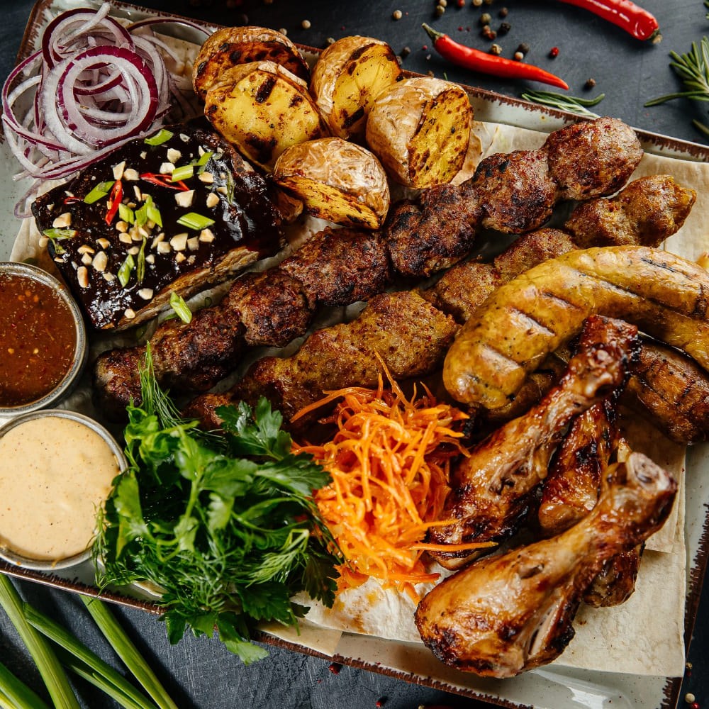Состав: купаты из индейки, шашлык из свиной шейки, шашлык из свиной вырезки, шашлык из куриного бедра, шашлык из куриных крыльев, стейк из свиной шеи, шашлык из куриных ножек, люля- кебаб из говядины, люля-кебаб из баранины, печеный картофель, соуса, лаваш, маринованный лук
