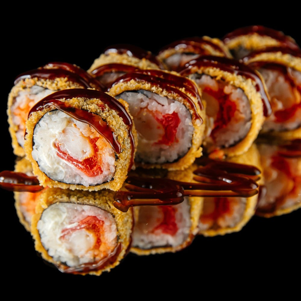 Состав: рис, нори, сыр творожный, креветка варёная, икара масаго, имбирь маринованный, соус унаги, соус спайси