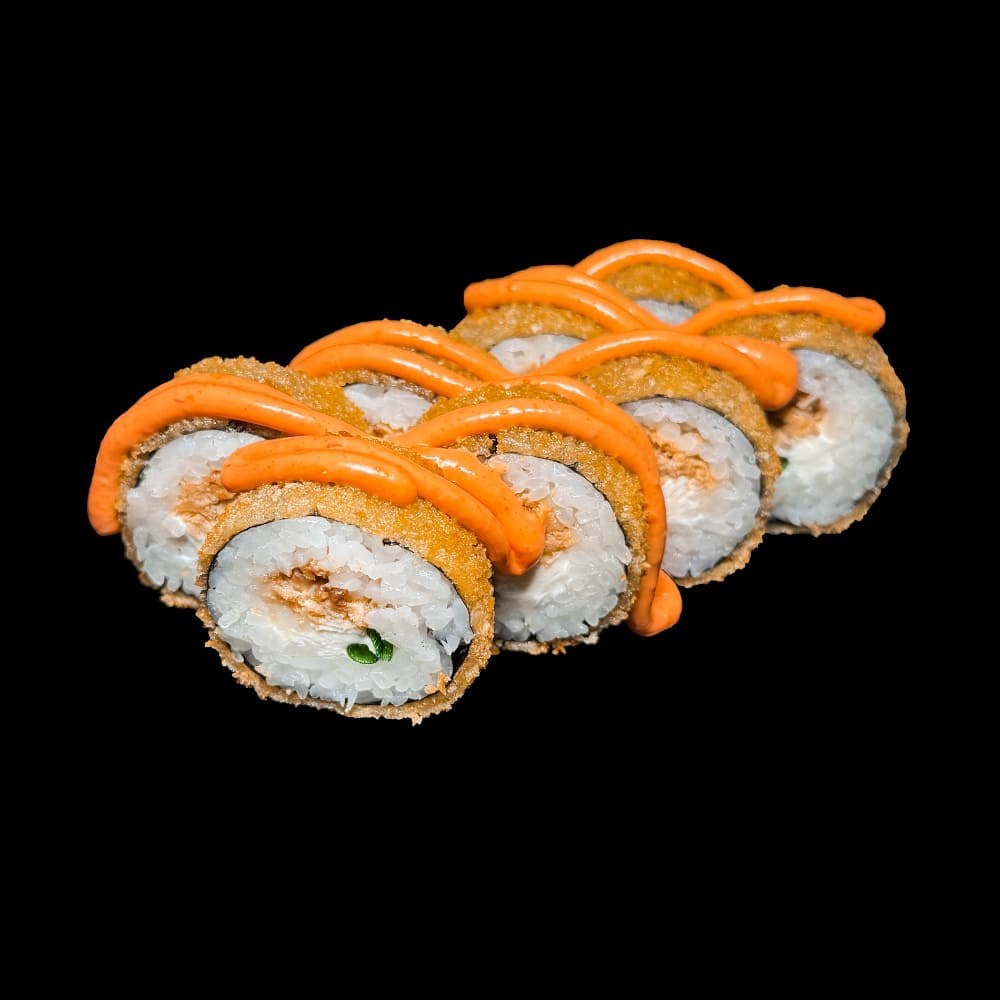 Состав: рис для роллов, нори, лосось терияки, сыр творожный, лук зеленый, кляр, сухари панировочные, соус сливочный чили