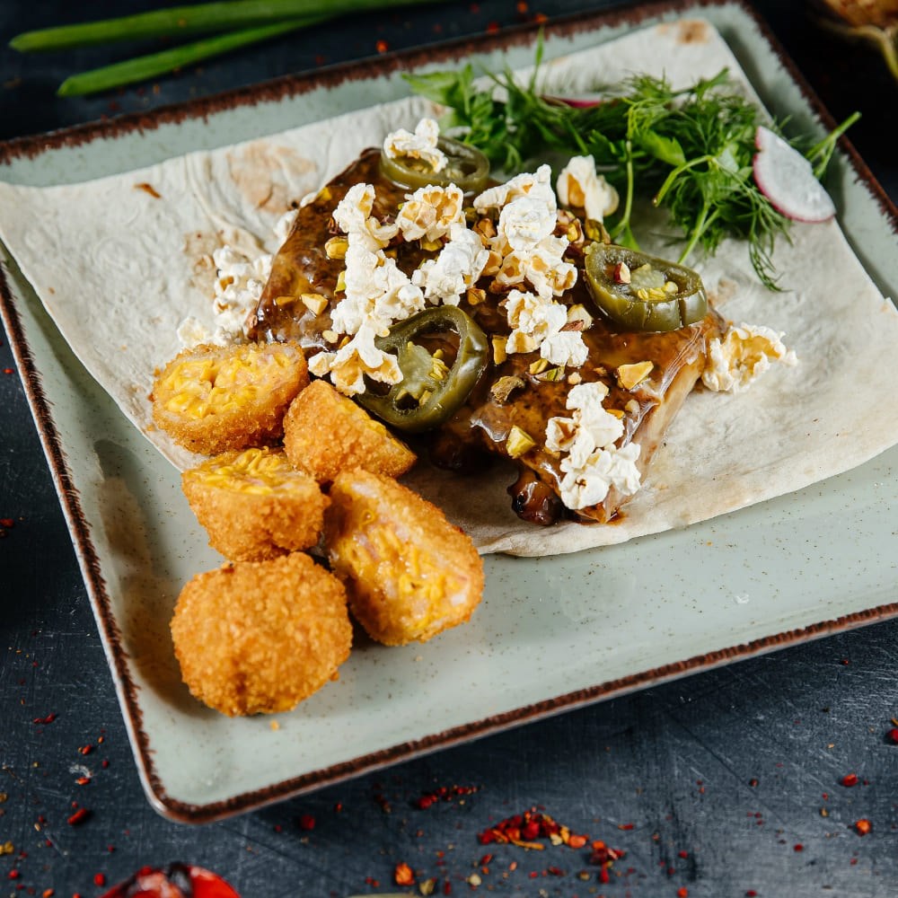 Состав: рёбра подаются с Аранчини из кукурузы с добавлением бекона и сыра.