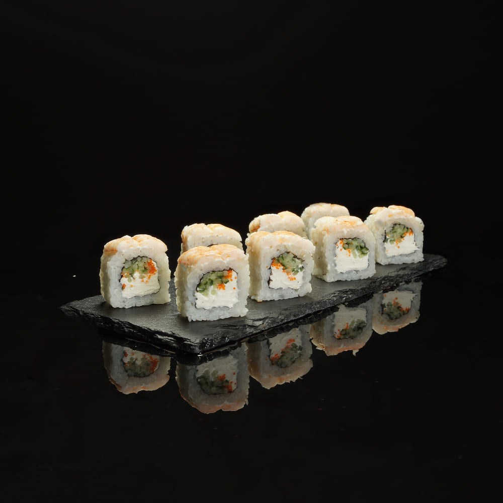 Состав: рис, водоросли нори, сыр творожный, огурец, креветка отварная, икра масаго