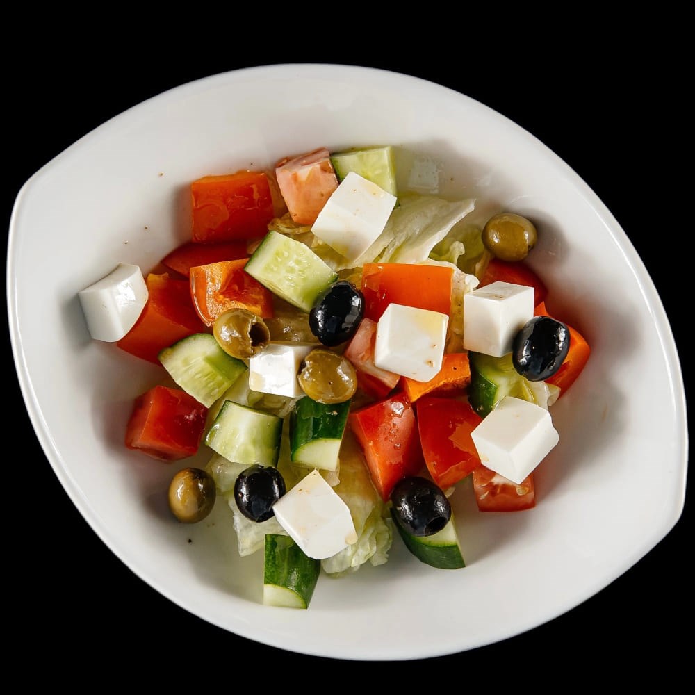 Состав: айсберг, помидор, огурец, перец болгарский, маслины, оливки, лук красный, фетакса, заправка фирменная