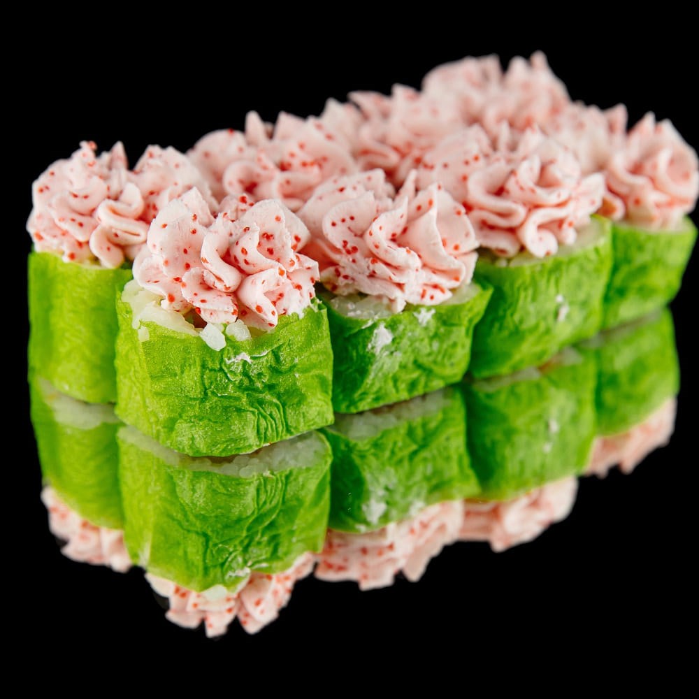 Состав: маменори зеленый, рис, копченый лосось, огурец, сыр с масагой