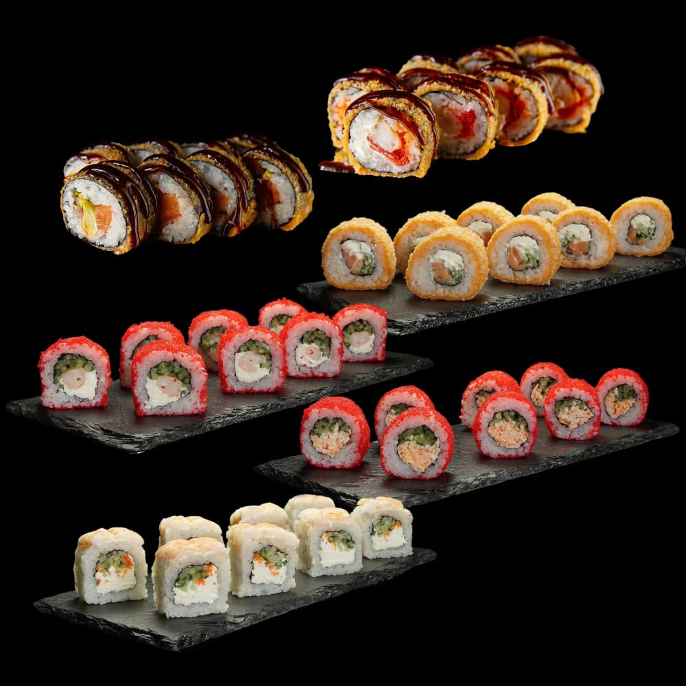 Мидийный: рис, водоросли нори, сыр творожный, томаты, мясо мидий, сырный соус для запекания, соус унаги