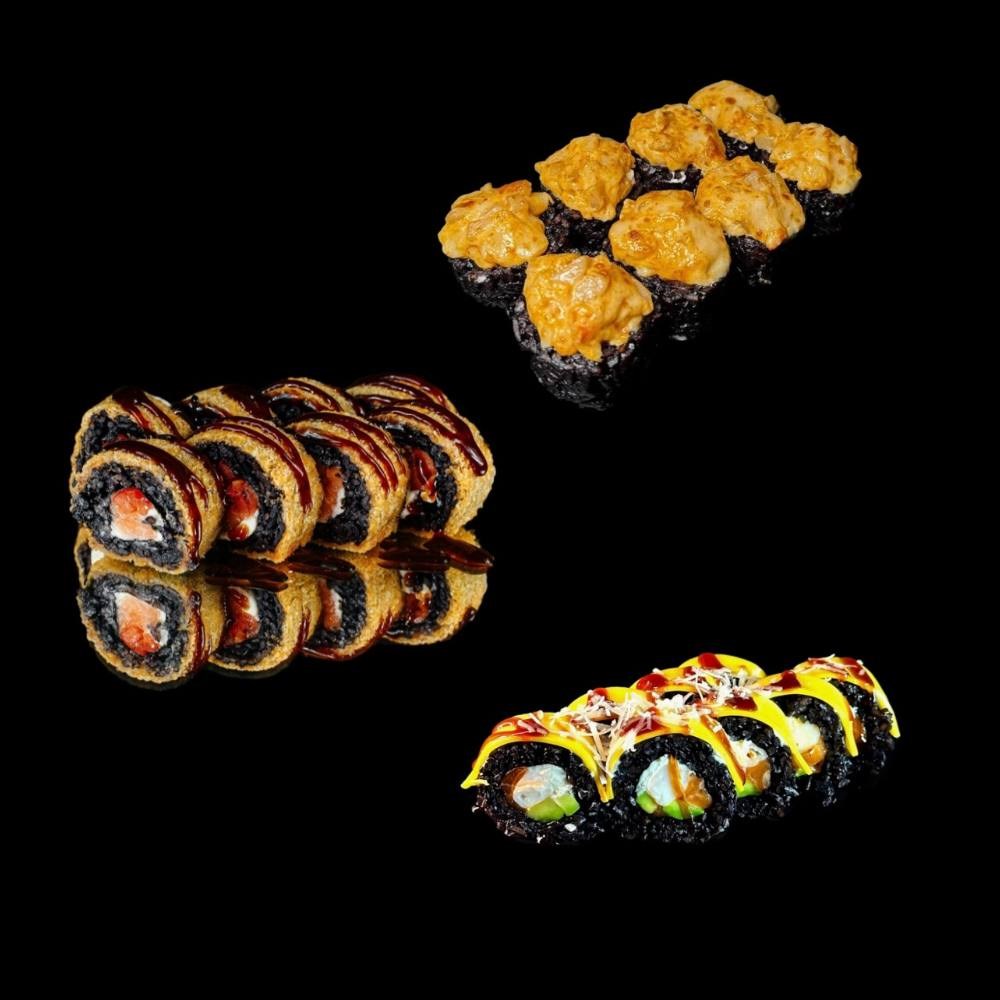 Контраст: рис черный, нори, сыр, креветка, лосось, авокадо, чеддер, унаги, пармезан