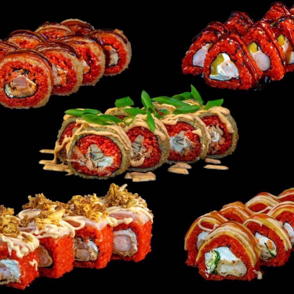 Морской: рис, водоросли нори, сыр творожный, лук зеленый, лосось, тунец, соус кимчи, кляр, сухари панировочные, соус тануки