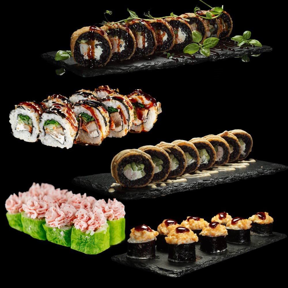 Тори BLACK: нори, рис для суши (черный), креветка отварная, снежный краб, огурец, соус спайси, сыр творожный, кляр, сухари панировочные, соус унаги