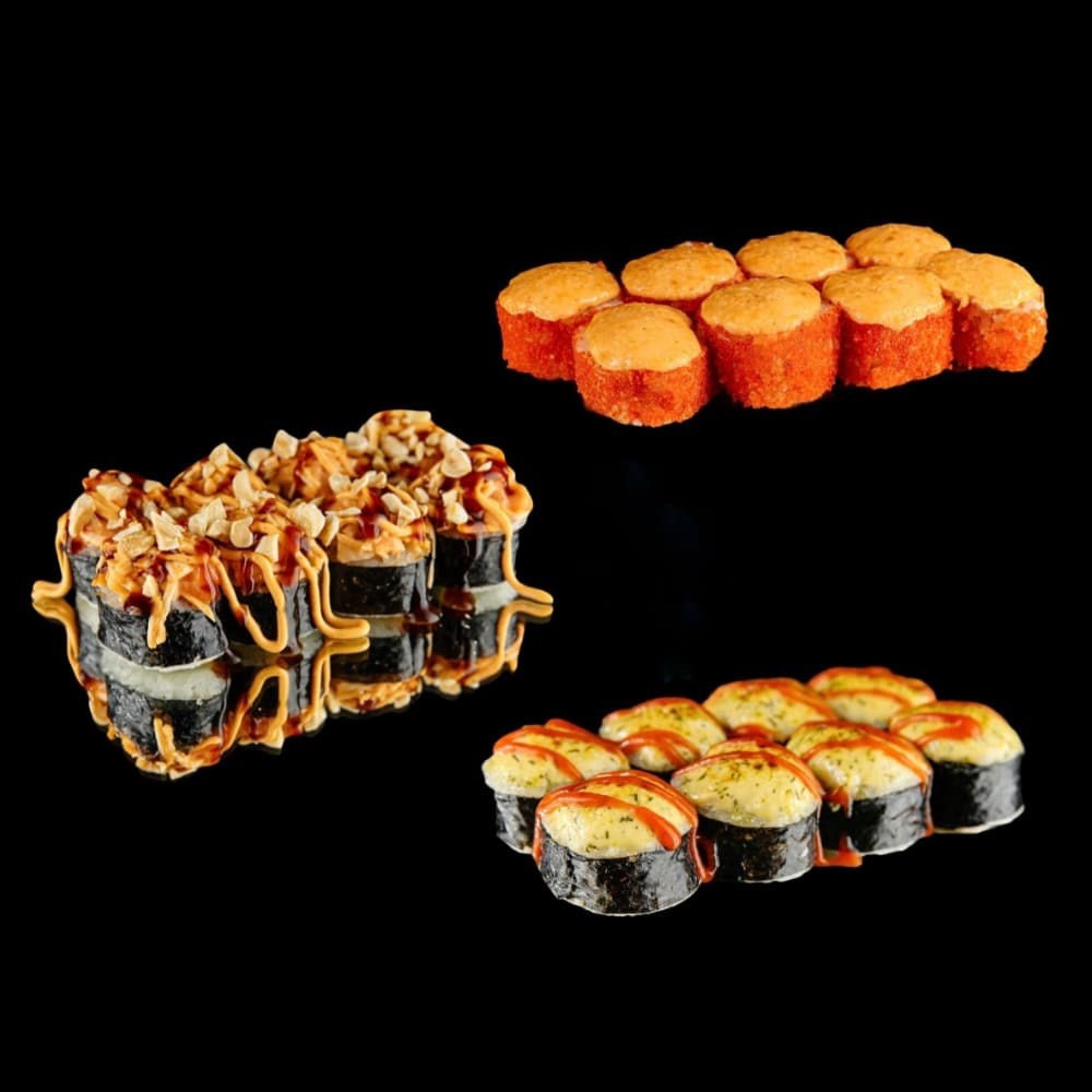 Мидийный: рис, водоросли нори, сыр творожный, томаты, мясо мидий, сырный соус для запекания, соус унаги