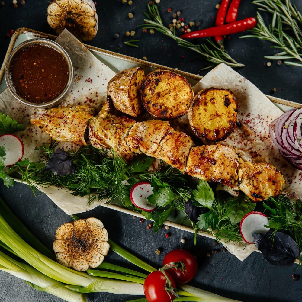 Состав: подается с печеным картофелем, лавашем, маринованным луком, соусом Сацебели