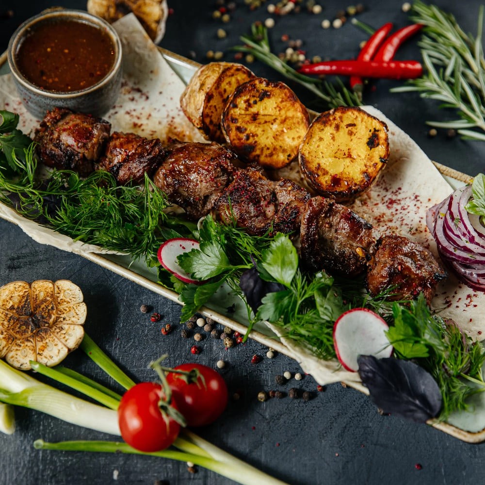 Состав: подается с печеным картофелем, лавашем, маринованным луком, соусом Сацебели.