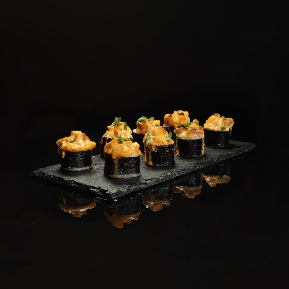 Состав: рис, водоросли нори, сыр творожный, огурец, лосось, фирменный соус, лук зеленый