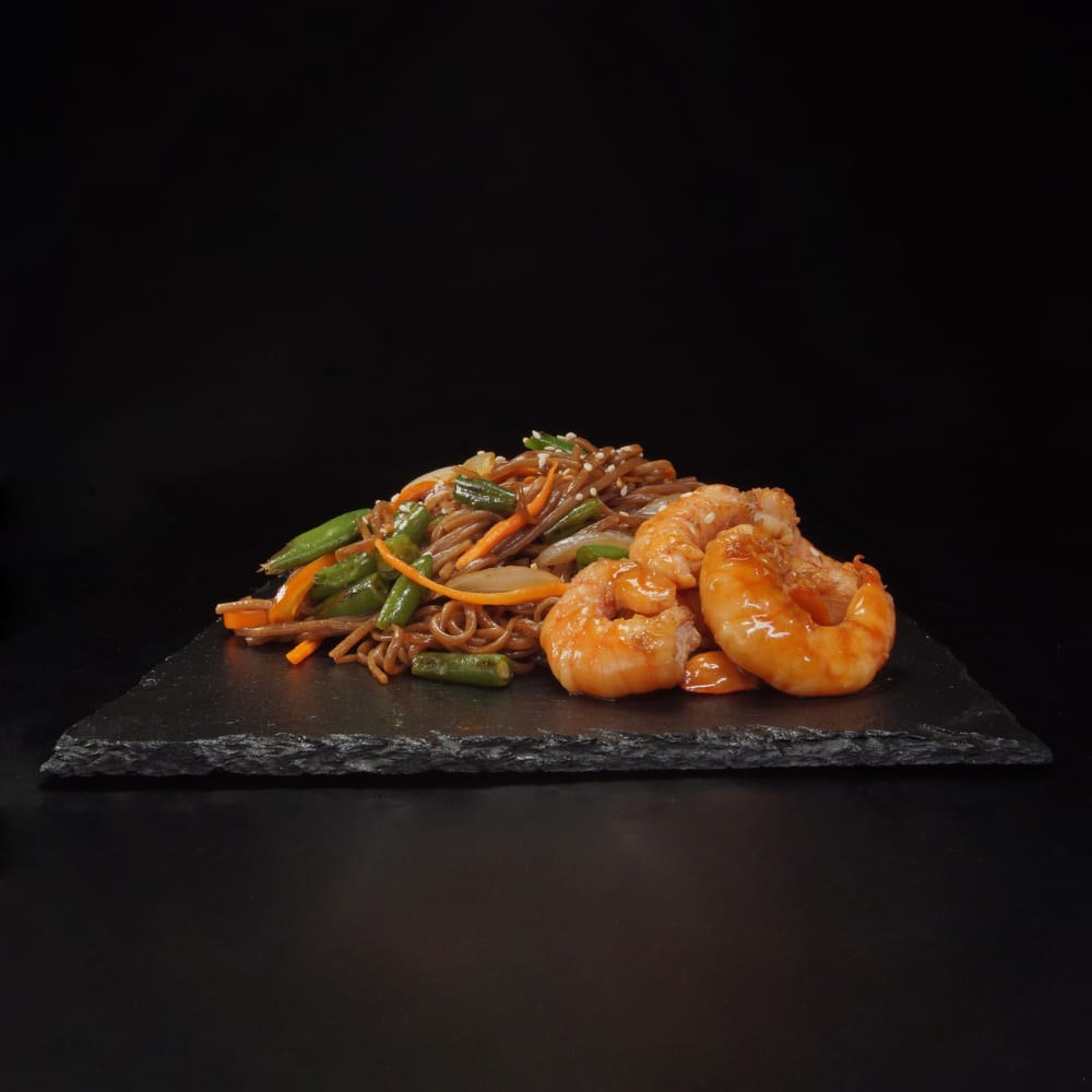 Состав: масло подсолнечное, креветки маринованные, морковь, лук репчатый, фасоль стручковая, перец болгарский, бульон суимоно, соевый соус, лапша соба, соус на выбор, кунжут белый