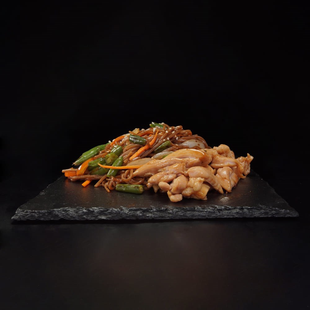 Состав: масло подсолнечное, филе красного мяса, морковь, лук репчатый, фасоль стручковая, перец болгарский, бульон суимоно, соевый соус, лапша соба, соус на выбор, кунжут белый