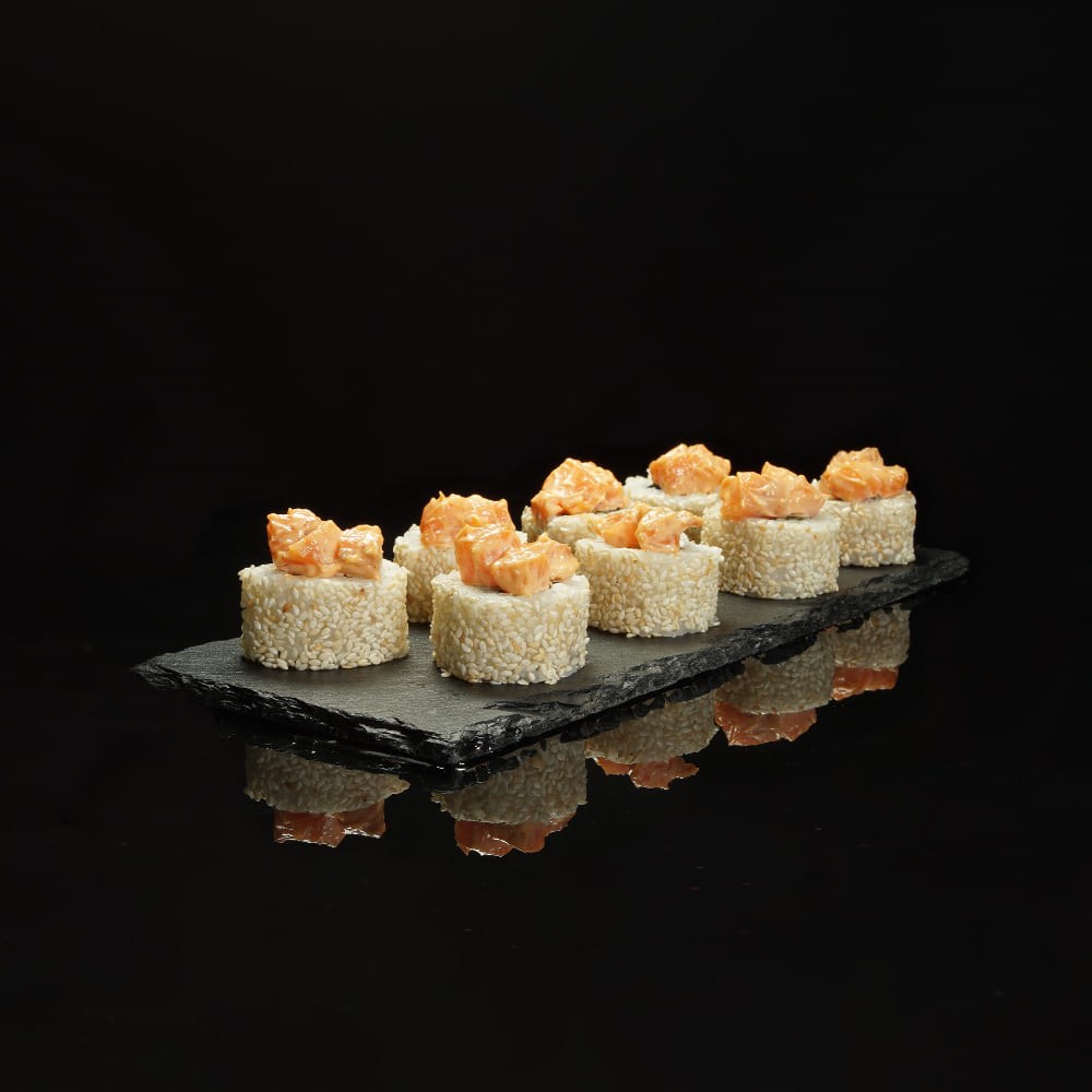 Состав: рис, водоросли нори, сыр творожный, огурец, лосось филе, соус спайси, кунжут