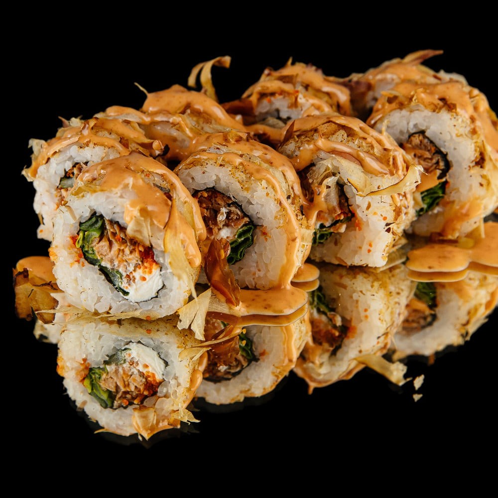 Состав: рис, нори, сыр творожный, масаго оранжевая, лосось терияки, лук зеленый, бонито, соус шичими