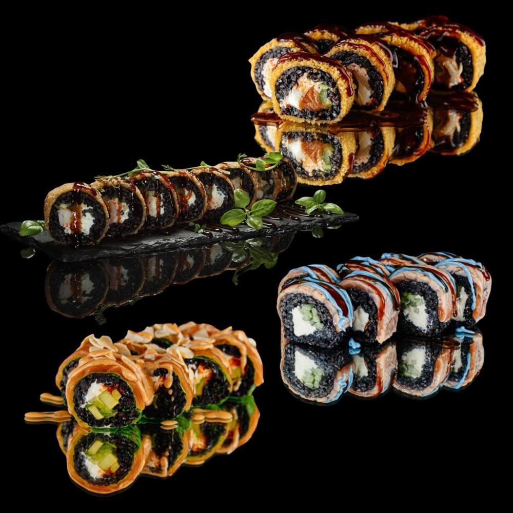 Тори блек: нори, рис для суши (черный), креветка отварная, снежный краб, огурец, соус спайси, сыр творожный, кляр, сухари панировочные, соус унаги