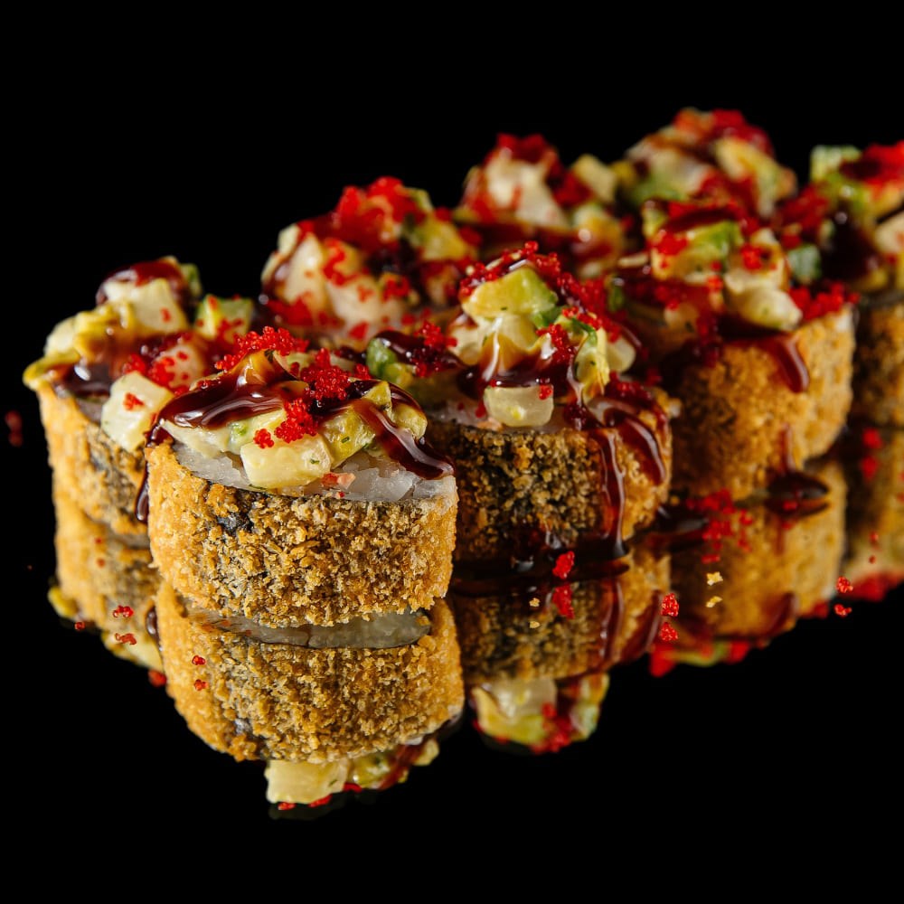 Состав: рис, нори, сыр творожный, краб, авокадо, гребешок, соус чесночный, соус унаги, икар масаго красная, кунжут микс, кляр, панировочные сухари
