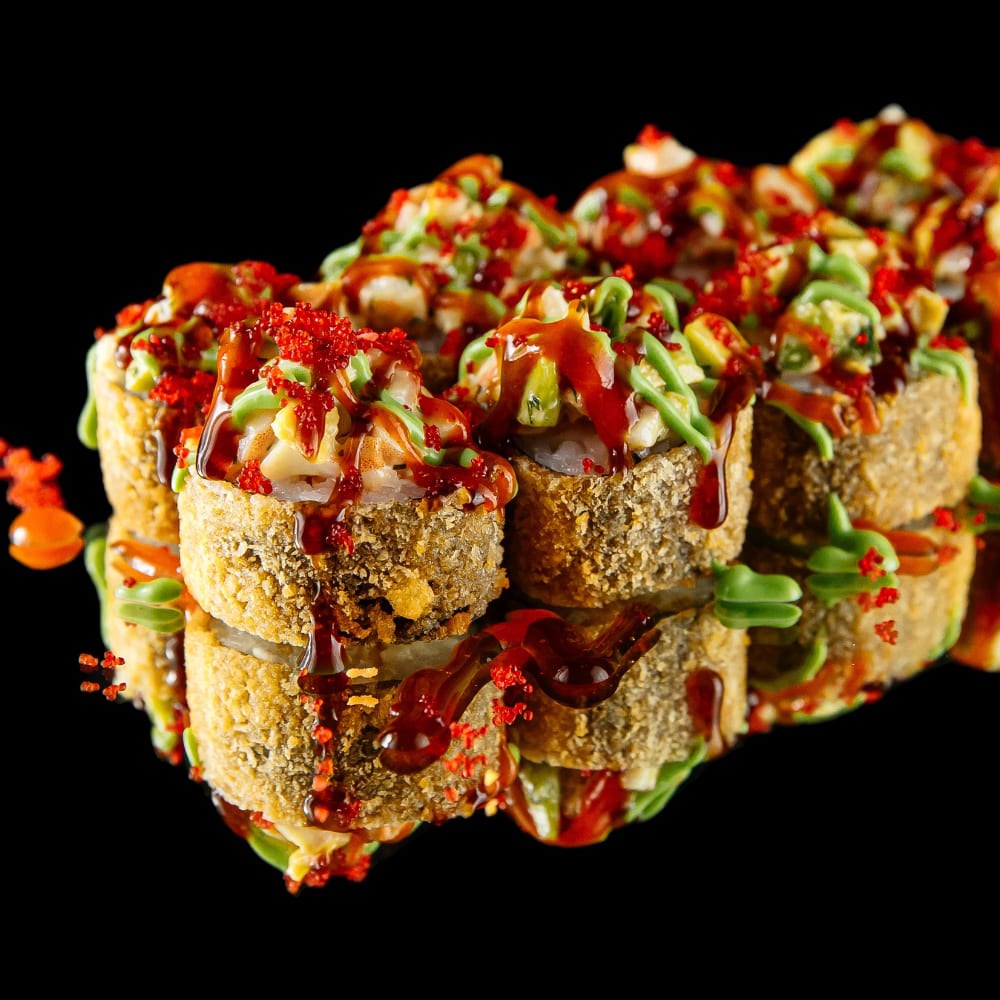 Состав: рис, нори, сыр творожный, краб, креветка варёная, авокадо, чесночный соус, соус васаби, икра масаго, соус унаги, соус шрирача, кляр, панировочные сухари