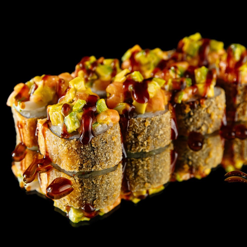 Состав: рис, нори, сыр творожный, пекинская капуста, лосось, авокадо, соус сырный, соус унаги, кляр, панировочные сухари