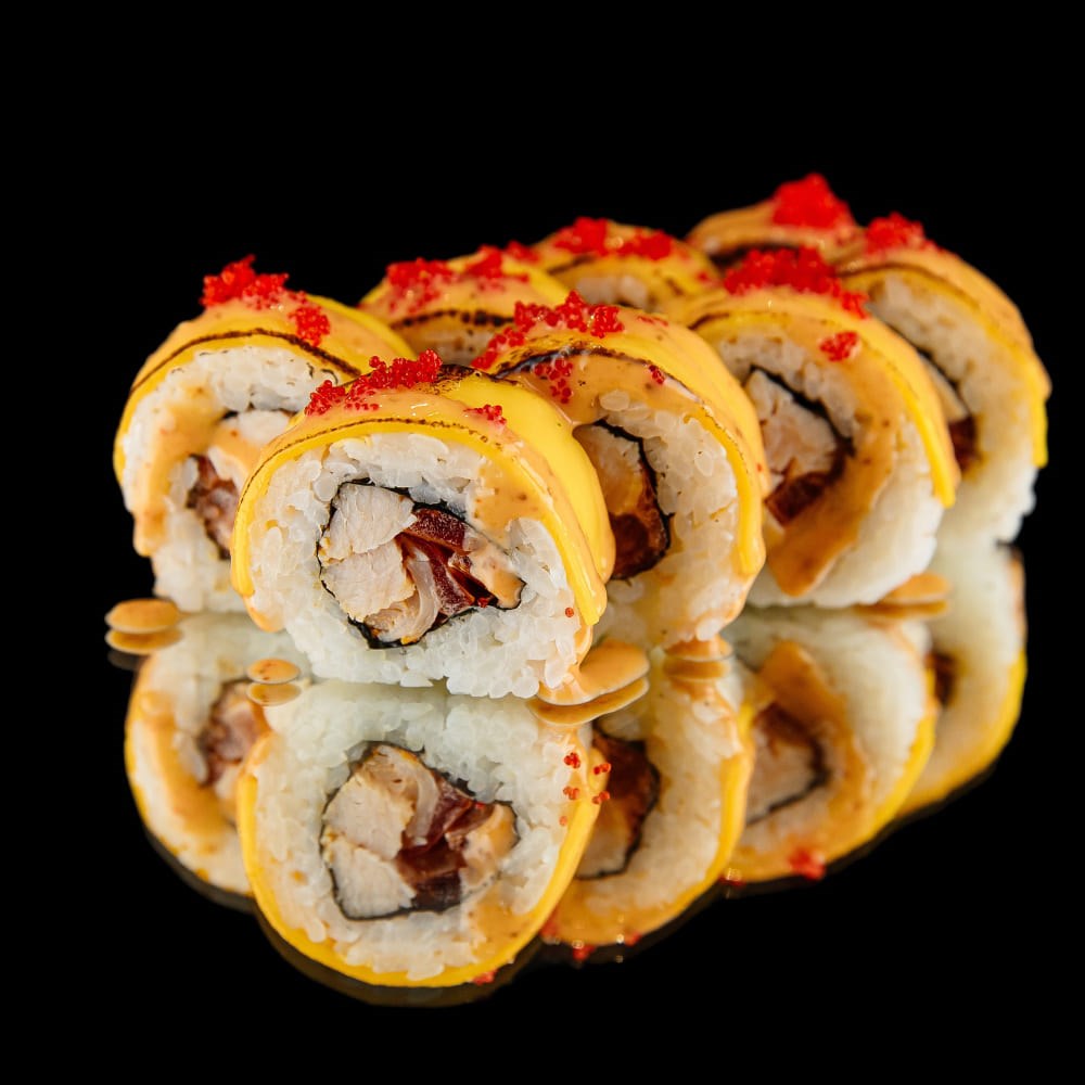 Состав: рис черный, нори, грудка копченая, соус спайси, помидор, сыр Чеддер, соус шичими, масаго красная