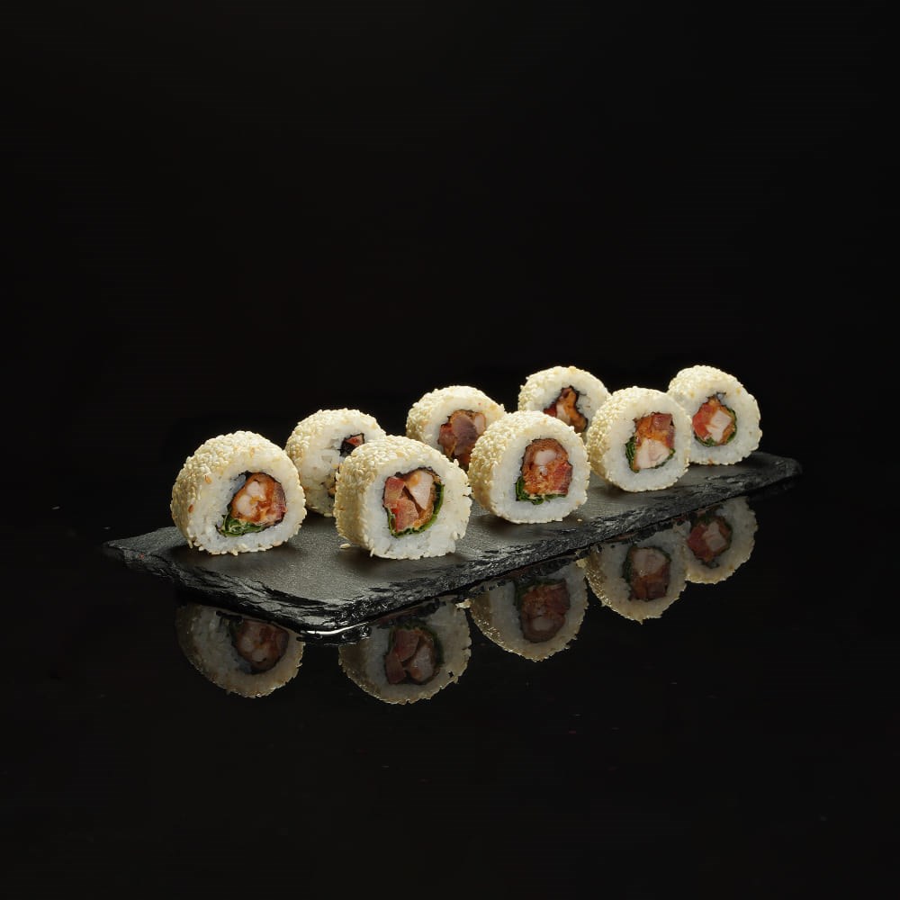 Состав: рис, водоросли нори, соус спайси, томаты, курица жареная, лук зеленый, кунжут
