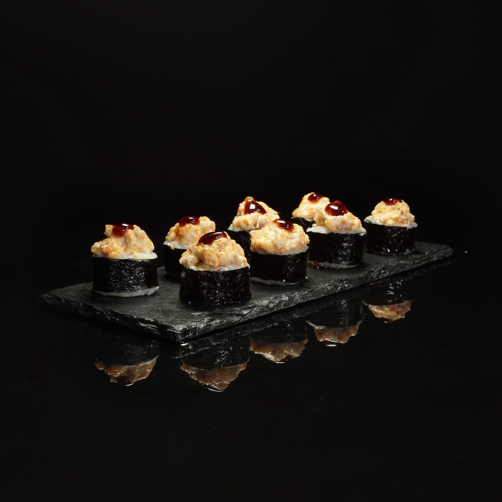Состав: рис, водоросли нори, сыр творожный, сыр чеддер, лук зеленый, тунец, сырный соус для запекания, соус унаги