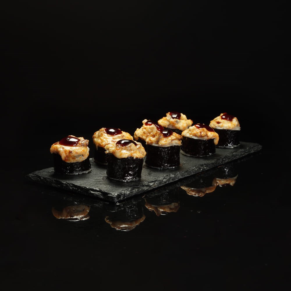 Состав: рис, водоросли нори, сыр творожный, манго, *унаги, сырный соус для запекания, соус унаги