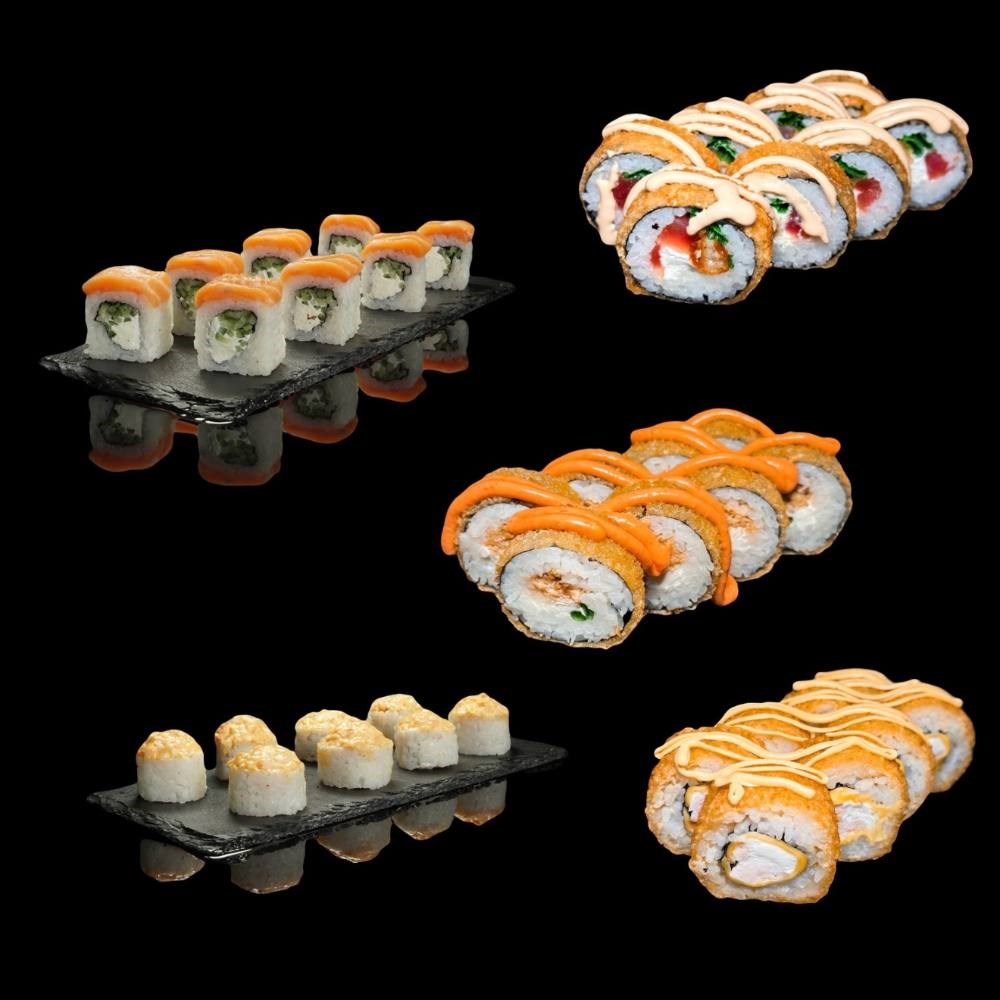 Монако: рис, водоросли нори, сыр творожный, креветка отварная, огурец икра масаго, сырный соус для запекания, соус унаги, соус чили манго