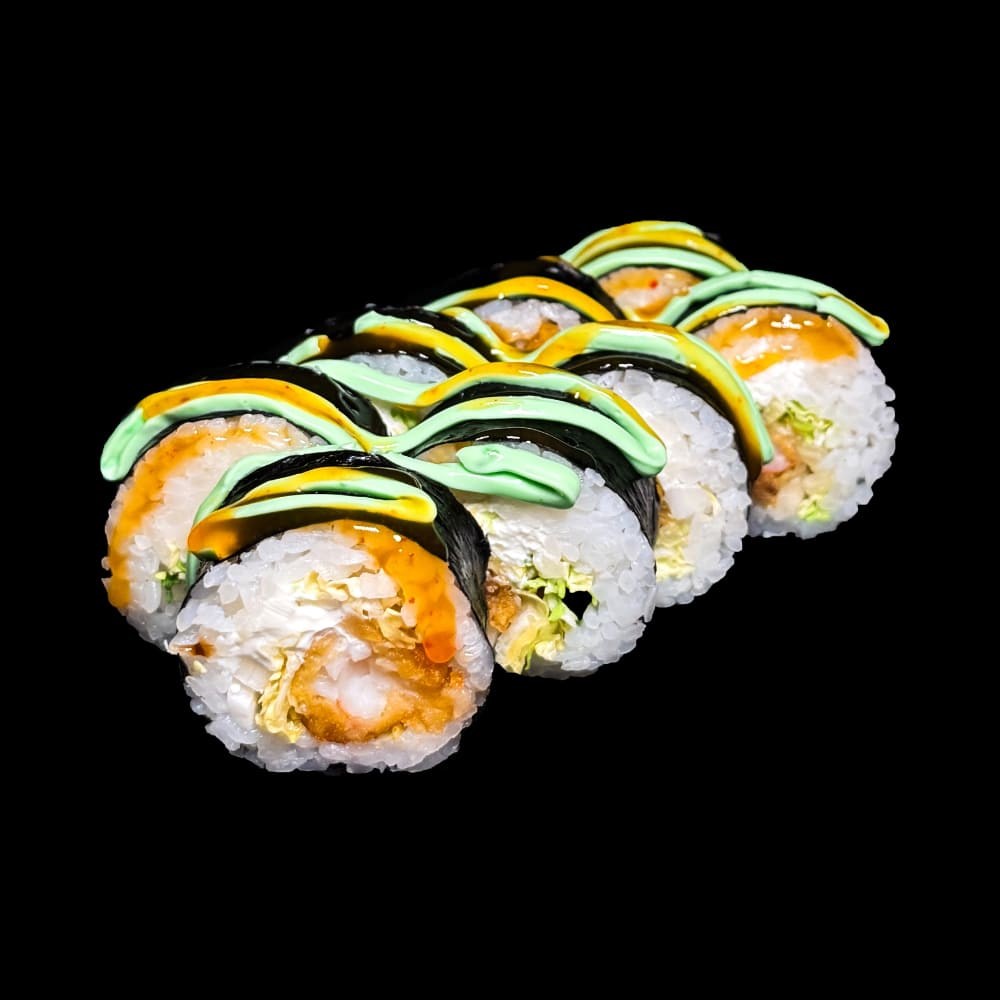 Состав: рис для роллов черный, нори, окунь в кляре, сыр творожный, томаго, соус унаги