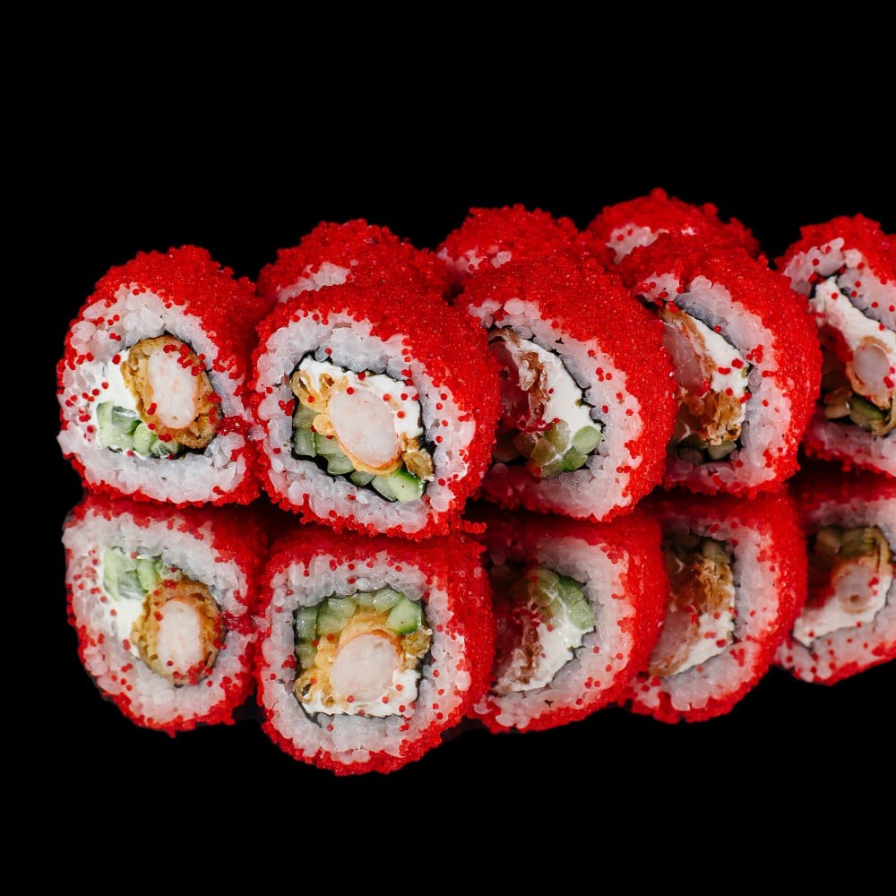 Состав: рис, нори, сыр творожный, креветки темпура, огурец, масаго